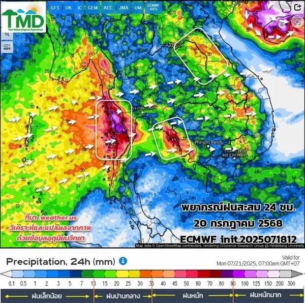 ข้อควรระวังในช่วงวันที่ 19-25 ก.ค. ขอให้ประชาชนบริเวณประเทศไทย โดยเฉพาะภาคเหนือ ภาคตะวันออกเฉียงเหนือ ภาคกลางด้านตะวันตก ภาคตะวันออก และภาคใต้ฝั่งตะวันตก ระวังอันตรายจากฝนตกหนักถึงหนักมากและฝนที่ตกสะสม ซึ่งอาจทำให้เกิดน้ำท่วมฉับพลันและน้ำป่าไหลหลาก โดยเฉพาะพื้นที่ลาดเชิงเขาใกล้ทางน้ำไหลผ่านและพื้นที่ลุ่ม