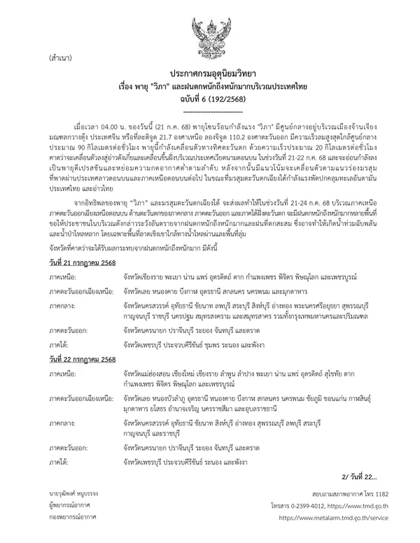 กรมอุตุนิยมวิทยา ประกาศเรื่อง พายุ "วิภา" และฝนตกหนักถึงหนักมากบริเวณประเทศไทย ฉบับที่ 6 (192/2568)
