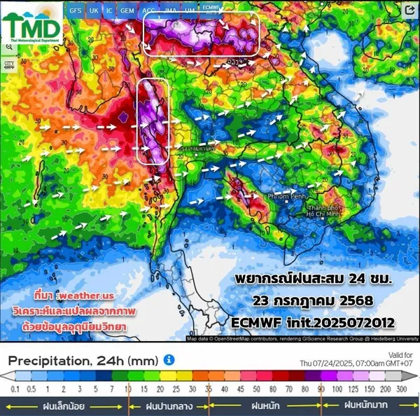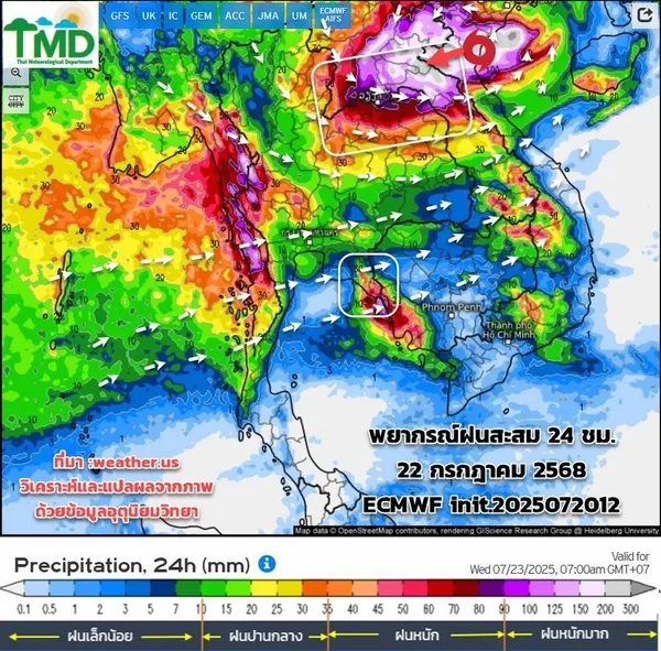 ในช่วงวันที่ 21 - 24 ก.ค. ขอให้ประชาชนบริเวณประเทศไทย โดยเฉพาะภาคเหนือ ภาคตะวันออกเฉียงเหนือ ภาคกลางด้านตะวันตก ภาคตะวันออก และภาคใต้ฝั่งตะวันตก ระวังอันตรายจากฝนตกหนักถึงหนักมากและฝนที่ตกสะสม ซึ่งอาจทำให้เกิดน้ำท่วมฉับพลันและน้ำป่าไหลหลาก โดยเฉพาะพื้นที่ลาดเชิงเขาใกล้ทางน้ำไหลผ่านและพื้นที่ลุ่ม