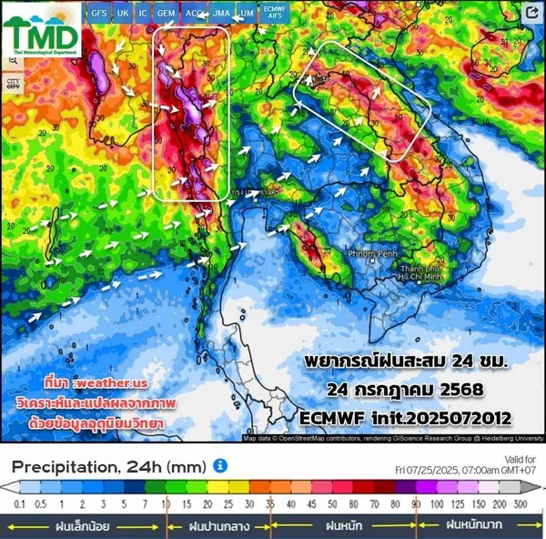 - พื้นที่เสี่ยงภัยฝนตกหนักถึงหนักมากบริเวณประเทศไทยวันที่ 21 ก.ค.68