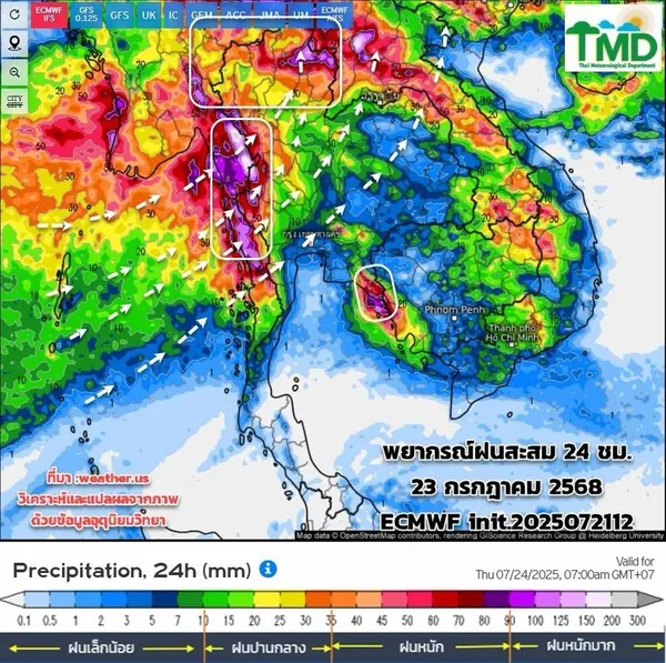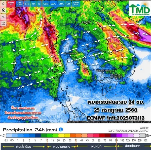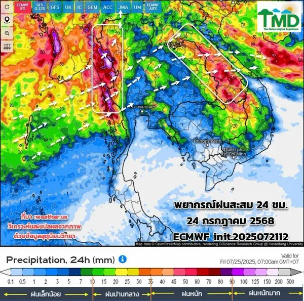 อนึ่ง พายุโซนร้อน "วิภา" บริเวณชายฝั่งเขตปกครองตนเองกว่างซีจ้วง มณฑลกว่างซี ประเทศจีน คาดว่าพายุนี้จะเคลื่อนขึ้นฝั่งบริเวณเมืองท้ายบิ่ญ ประเทศเวียดนามในวันนี้ (22 ก.ค. 68) และจะอ่อนกำลังลงเป็นพายุดีเปรสชันและหย่อมความกดอากาศต่ำตามลำดับ หลังจากนั้นพายุนี้มีแนวโน้มจะเคลื่อนตัวตามแนวร่องมรสุมที่พาดผ่านประเทศลาวตอนบนและภาคเหนือตอนบนต่อไป