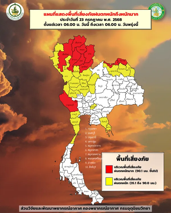 กรมอุตุฯ ได้ประกาศพื้นที่เสี่ยงภัยฝนตกหนักระดับสีแดง ซึ่งหมายถึงพื้นที่ที่มีความเสี่ยงสูงต่ออุทกภัย ดินถล่ม และน้ำป่าไหลหลาก โดยประกาศมีผลจนถึงเวลา 06.00 น. ของวันที่ 23 กรกฎาคม 2568