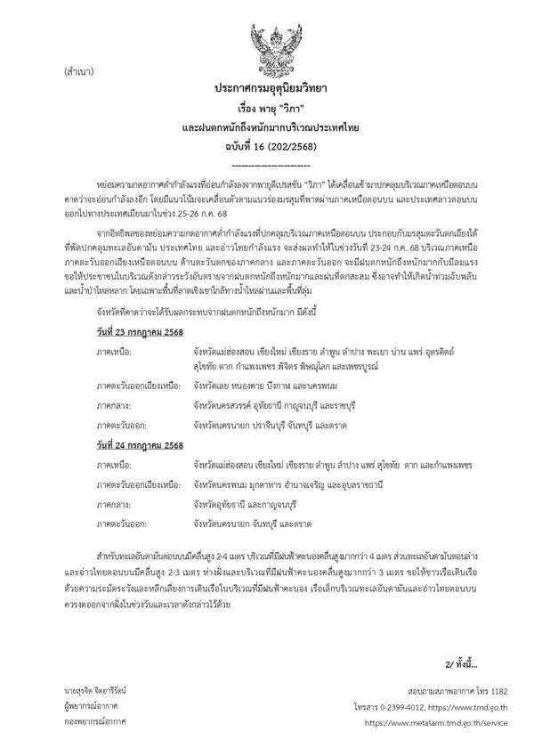 กรมอุตุนิยมวิทยา ประกาศ เรื่อง พายุ "วิภา" และฝนตกหนักถึงหนักมากบริเวณประเทศไทย ฉบับที่ 16