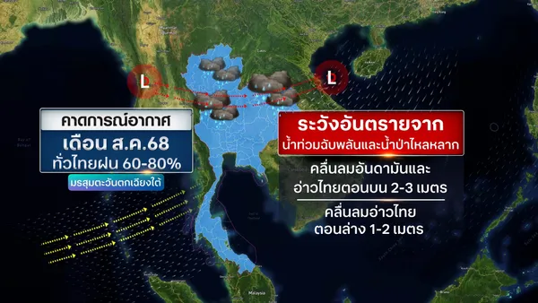 เข้าสู่ฤดูฝนมาแล้วกว่า 2 เดือน ล่าสุดกรมอุตุนิยมวิทยาเผยแนวโน้มสภาพอากาศในเดือนสิงหาคม 2568 คาดว่าทั่วประเทศไทยจะยังคงมีฝนตกชุกหนาแน่น โดยมีฝนฟ้าคะนองครอบคลุมราว 60-80% ของพื้นที่ทั่วประเทศ
