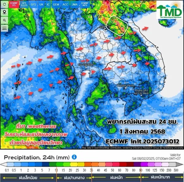 กรมอุตุนิยมวิทยาคาดการณ์สภาพอากาศในช่วงวันที่ 31 ก.ค. – 5 ส.ค. ประเทศไทยตอนบนจะมีฝนลดลง แต่ยังคงมีฝนตกหนักบางแห่งในภาคเหนือ และภาคตะวันออกเฉียงเหนือตอนบน เนื่องจากมรสุมตะวันตกเฉียงใต้ที่พัดปกคลุมทะเลอันดามัน ประเทศไทย และอ่าวไทยจะมีกำลังอ่อนลง ในขณะที่ยังคงมีหย่อมความกดอากาศต่ำบริเวณประเทศเวียดนามตอนบน