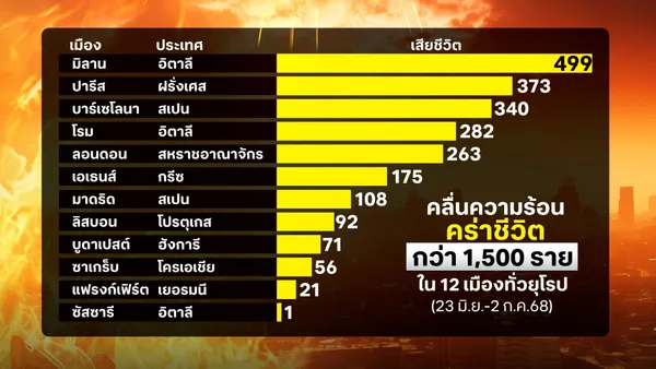 ด้านนักวิจัย ได้วิเคราะห์ข้อมูลตั้งแต่วันที่ 23 มิถุนายน ถึง 2 กรกฎาคม ครอบคลุม 12 เมืองในอิตาลี สเปน โปรตุเกส ฝรั่งเศส สหราชอาณาจักร กรีซ โครเอเชีย และฮังการี ในช่วงเวลา 10 วันดังกล่าว มีผู้เสียชีวิตจากคลื่นความร้อนทั้งหมด 2,300 ราย ในจำนวนนี้ 1,500 ราย (ราว 65%) เป็นผลโดยตรงจากภาวะโลกร้อนที่ทำให้อุณหภูมิพุ่งสูงขึ้นเกินปกติ โดยพบว่ามิลานมีผู้เสียชีวิตจากอากาศร้อนมากที่สุด 499 ราย ตามมาปารีส 373 ราย และบาร์เซโลนา 340 ราย ซึ่งแม้แต่เมืองในประเทศที่ปกติมีสภาพอากาศเย็นก็ยังเผชิญผลกระทบ เช่น ลอนดอน และแฟรงก์เฟิร์ต