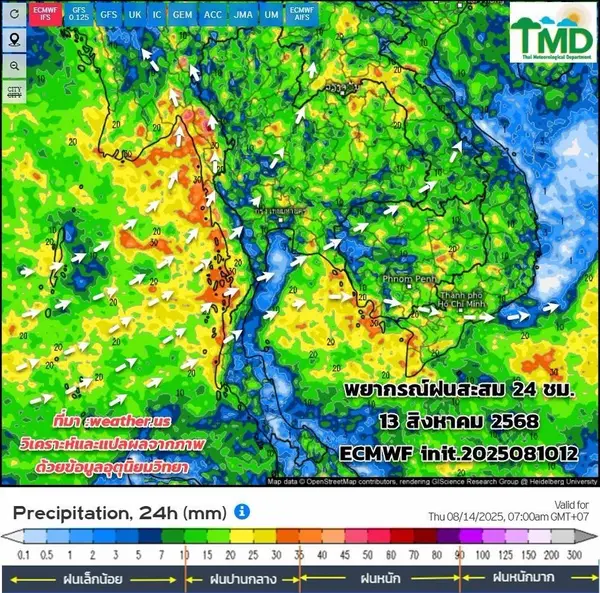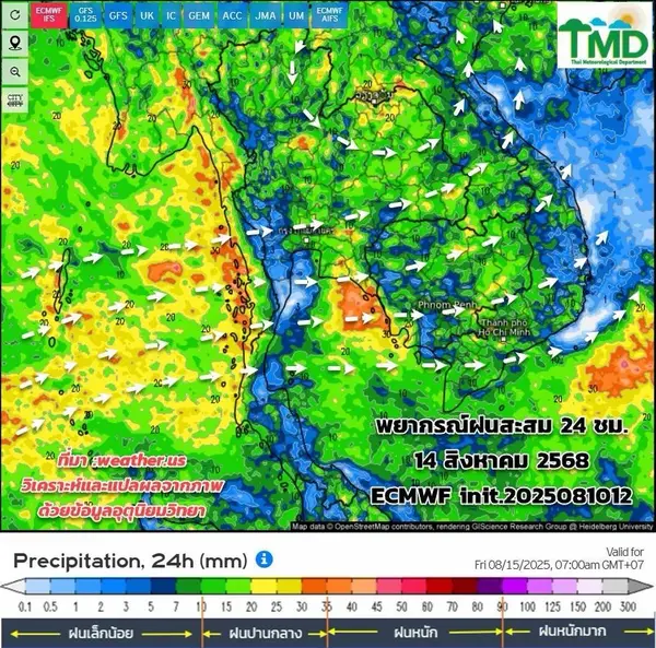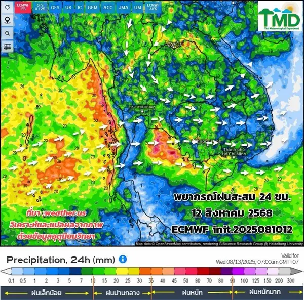 ในช่วง 11 – 16 ส.ค. ขอให้ประชาชนบริเวณประเทศไทยระวังอันตรายจากฝนตกหนักถึงหนักมากและฝนที่ตกสะสม ซึ่งอาจทำให้เกิดน้ำท่วมฉับพลันและน้ำป่าไหลหลาก โดยเฉพาะพื้นที่ลาดเชิงเขาใกล้ทางน้ำไหลผ่านและพื้นที่ลุ่มไว้ด้วย
