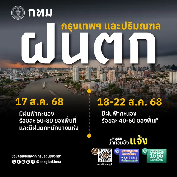 กรุงเทพมหานคร (กทม.) แจ้งเตือน ฝนตกในพื้นที่กรุงเทพฯ และปริมณฑล 17 สิงหาคม 2568 มีฝนร้อยละ 60-80 ของพื้นที่ และมีฝนตกหนักบางแห่ง และช่วง 18-22 สิงหาคม 2568 มีฝนฟ้าคะนอง ร้อยละ 40-60 ของพื้นที่