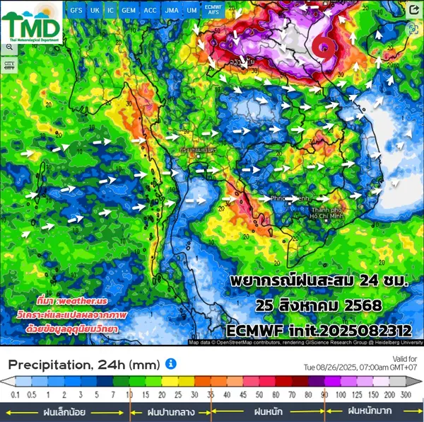กรมอุตุนิยมวิทยาคาดการณ์สภาพอากาศ 7 วันข้างหน้า ในช่วงวันที่ 24 – 27 ส.ค. ประเทศไทยจะมีฝนเพิ่มมากขึ้น และมีฝนตกหนักถึงหนักมากหลายพื้นที่ กับมีลมแรง เนื่องจากอิทธิพลของพายุประกอบกับร่องมรสุมพาดผ่านภาคเหนือและภาคตะวันออกเฉียงเหนือ ในขณะที่มรสุมตะวันตกเฉียงใต้ที่พัดปกคลุมทะเลอันดามัน ประเทศไทย และอ่าวไทยจะมีกำลังแรงขึ้น ส่วนในช่วงวันที่ 28 – 29 ส.ค. ประเทศไทยยังคงมีฝนตกหนักบางแห่ง เนื่องจากร่องมรสุมจะเลื่อนลงมาพาดผ่านภาคเหนือตอนล่าง ภาคกลางตอนบน และภาคตะวันออกเฉียงเหนือ ประกอบกับมรสุมตะวันตกเฉียงใต้ที่พัดปกคลุมทะเลอันดามัน ประเทศไทย และอ่าวไทยมีกำลังปานกลาง