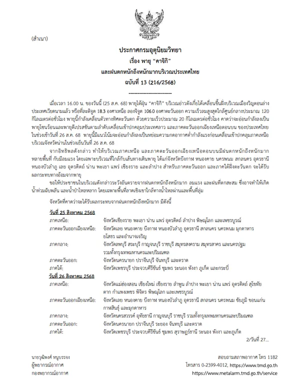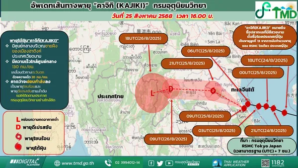 เมื่อเวลา 16.00 น. วันที่ 25 สิงหาคม 2568 กรมอุตุนิยมวิทยา รายงานว่า พายุไต้ฝุ่น “คาจิกิ” (Kajiki) บริเวณอ่าวตังเกี๋ย ได้เคลื่อนขึ้นฝั่งที่เมืองวิญ ประเทศเวียดนามแล้ว โดยมีความเร็วลมสูงสุดใกล้ศูนย์กลางประมาณ 120 กิโลเมตรต่อชั่วโมง พายุเคลื่อนตัวทางทิศตะวันตกด้วยความเร็ว 20 กิโลเมตรต่อชั่วโมง คาดว่าจะอ่อนกำลังลงเป็นพายุโซนร้อน และพายุดีเปรสชัน ก่อนเข้าสู่ สปป.ลาว และภาคตะวันออกเฉียงเหนือตอนบนของไทยเช้าวันที่ 26 สิงหาคม 2568 และอ่อนกำลังเป็นหย่อมความกดอากาศต่ำกำลังแรงบริเวณจังหวัดน่านในช่วงเย็นวันเดียวกัน
