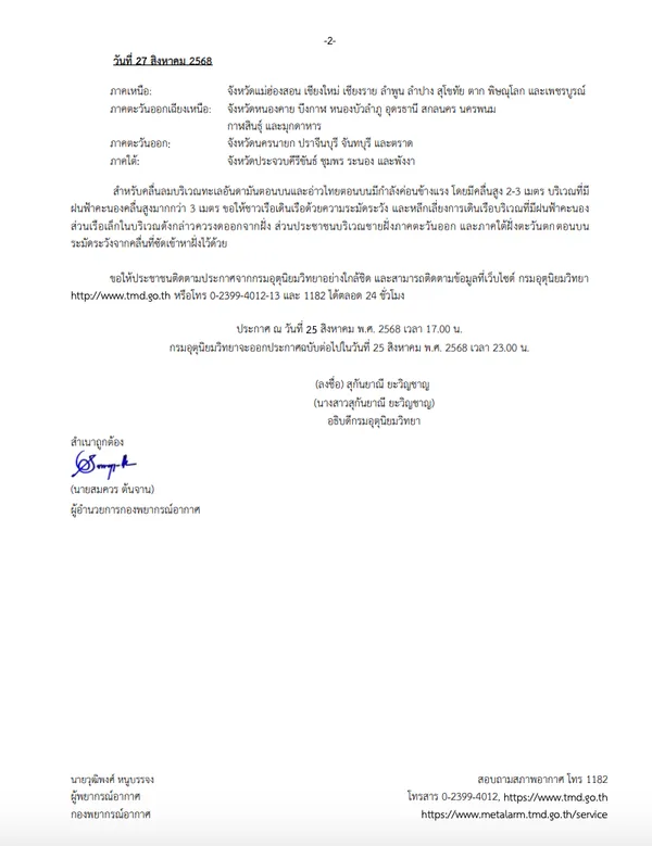 - 27 ส.ค. 68: ฝนตกหนักต่อเนื่อง โดยเฉพาะภาคเหนือ (เชียงใหม่ ตาก สุโขทัย ฯลฯ), ภาคอีสานตอนบน และภาคตะวันออก (ปราจีนบุรี จันทบุรี ตราด)