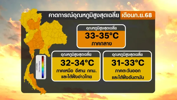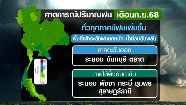 กรมอุตุนิยมวิทยาเผยการคาดการณ์สภาพอากาศเดือนกันยายน 2568 ซึ่งเป็นเดือนที่ประเทศไทยมีฝนตกชุกหนาแน่นมากที่สุดในรอบปี โดยได้รับอิทธิพลจากร่องมรสุมและมรสุมตะวันตกเฉียงใต้ ส่งผลให้ปริมาณฝนครอบคลุมเกือบทั่วทุกภาคของประเทศ