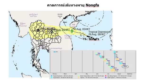 อย่าเพิ่งเบื่อพายุ มาอีกแล้วทุกแบบจำลองคาดการณ์จะมีพายุเกิดขึ้น ถ้าเป็นพายุโซนร้อนจะมีชื่อว่า “Nongfa” ขณะนี้ยังเป็นพายุดีเปรสชั่นอยู่ในทะเลจีนใต้ ศูนย์อุตุฯฮ่องกงคาดว่าจะพัฒนาเป็นพายุโซนร้อนเข้าเวียดนามวันที่ 30 สิงหาคม และลดกำลังลงเป็นดีเปรสชั่นก่อนเข้าประเทศไทย โดยจะเริ่มส่งผลกระทบต่อบ้านเราในภาคตะวันออกเฉียงเหนือ (ตอนบน และตอนกลาง) ช่วงเย็นๆ ตลอดทั้งคืนวันที่ 30 สิงหาคม และลดกำลังลงเป็นหย่อมความกดอากาศต่ำปกคลุมภาคเหนือ ภาคกลางตอนบนวันที่ 31 สิงหาคม