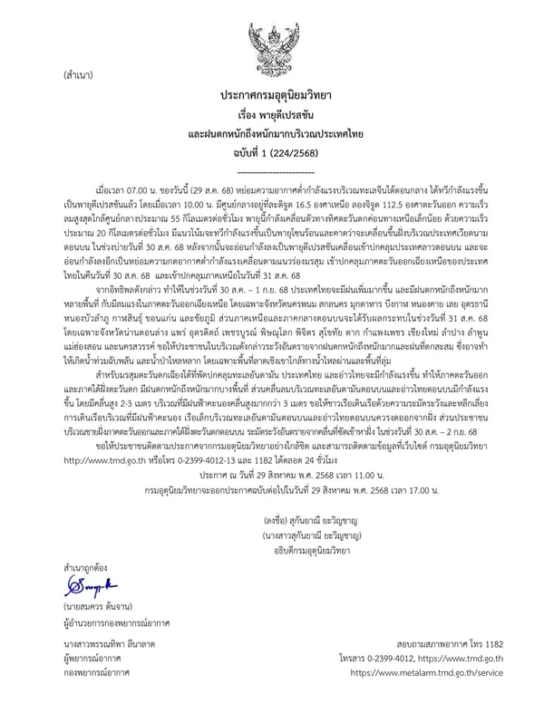กรมอุตุนิยมวิทยา เตือน พายุดีเปรสชัน และฝนตกหนักถึงหนักมากบริเวณประเทศไทย ฉบับที่ 1 (224/2568)