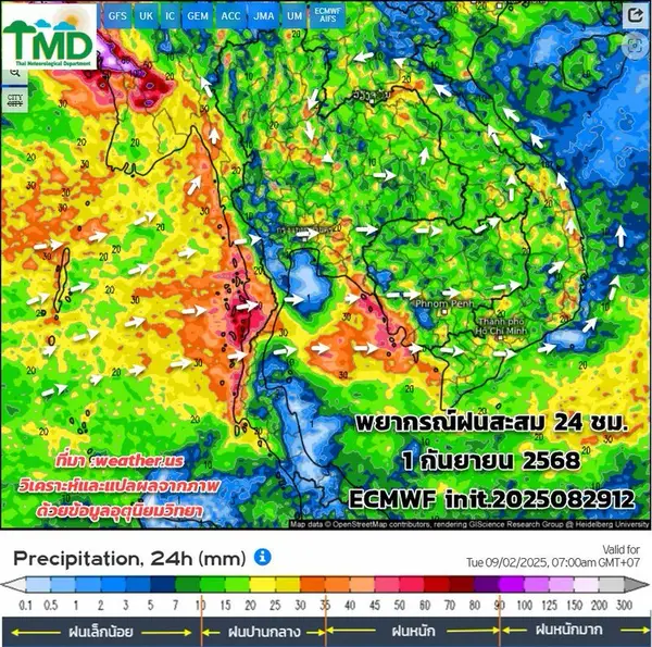 ส่วนในช่วงวันที่ 1 – 5 ก.ย. ประเทศไทยยังคงมีฝนตกต่อเนื่อง และมีฝนตกหนักบางแห่ง โดยมีฝนตกหนักมากพื้นที่ในภาคตะวันออก และภาคใต้ฝั่งตะวันตก เนื่องจากร่องมรสุมพาดผ่านภาคเหนือ ภาคกลางตอนบน และภาคตะวันออกเฉียงเหนือ ประกอบกับมรสุมตะวันตกเฉียงใต้กำลังค่อนข้างแรงพัดปกคลุมทะเลอันดามัน ภาคใต้ และอ่าวไทย