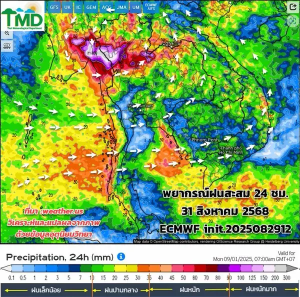 ข้อควรระวังในช่วงวันที่ 30 ส.ค. – 5 ก.ย. ขอให้ประชาชนบริเวณประเทศไทย โดยเฉพาะภาคเหนือ ภาคตะวันออกเฉียงเหนือ ภาคตะวันออก และภาคใต้ฝั่งตะวันตก ระวังอันตรายจากฝนตกหนักถึงหนักมากและฝนที่ตกสะสม ซึ่งอาจทำให้เกิดน้ำท่วมฉับพลันและน้ำป่าไหลหลาก โดยเฉพาะพื้นที่ลาดเชิงเขาใกล้ทางน้ำไหลผ่านและพื้นที่ลุ่ม