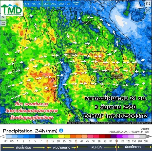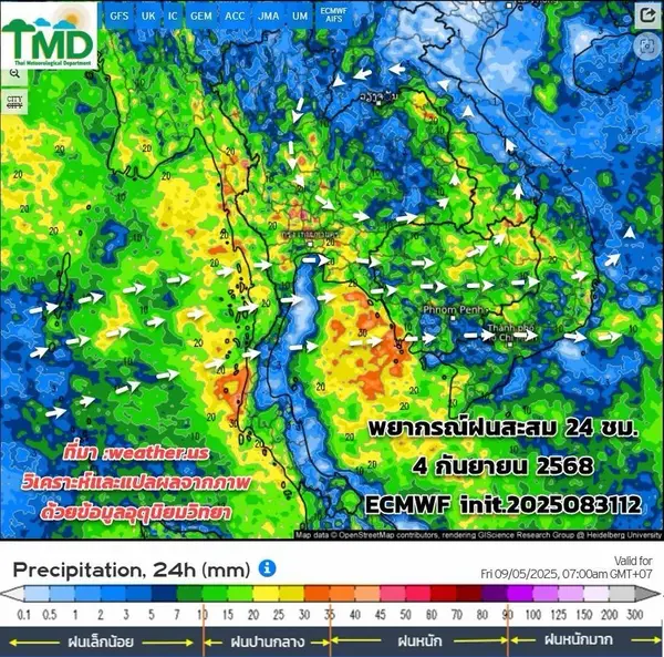 - 1-7 ก.ย. ฝนชุกต่อเนื่อง เตือนเหนือตอนล่าง 4 จังหวัด เฝ้าระวังน้ำหลาก