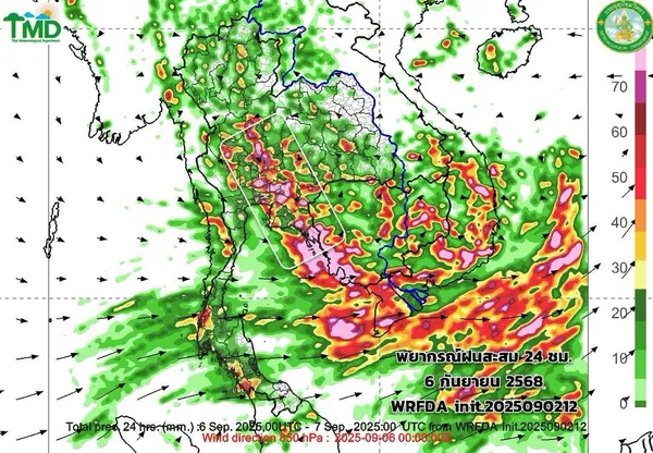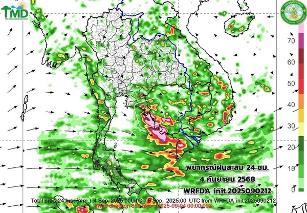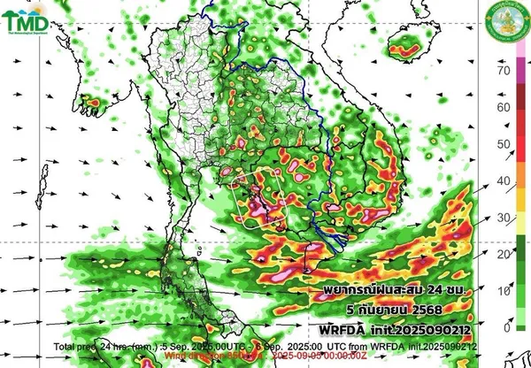 ในช่วงวันที่ 3 – 6 ก.ย. บริเวณภาคเหนือตอนล่าง ภาคตะวันออกเฉียงเหนือตอนล่าง ภาคกลางรวมทั้งกรุงเทพมหานครและปริมณฑล ภาคตะวันออก และภาคใต้มีฝนตกหนักบางแห่ง เนื่องจากร่องมรสุมจะเลื่อนลงมาพาดผ่านภาคกลาง ภาคตะวันออก และภาคตะวันออกเฉียงเหนือตอนล่าง ในขณะที่มรสุมตะวันตกเฉียงใต้ที่พัดปกคลุมทะเลอันดามัน ประเทศไทย และอ่าวไทย จะมีกำลังอ่อนลงเป็นกำลังปานกลาง