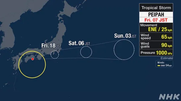 เฟซบุ๊ก สถานเอกอัครราชทูต ณ กรุงโตเกียว ประเทศญี่ปุ่น - 在東京タイ王国大使館 ระบุว่า ด้วยวันนี้ (5 ก.ย. 2568) กรมอุตุนิยมวิทยาญี่ปุ่นประกาศเตือนภัยพายุไต้ฝุ่นหมายเลข 15 (Peipah) ซึ่งเคลื่อนตัวขึ้นฝั่งทางตอนเหนือของจังหวัดวาคายามะแล้ว เมื่อเวลาประมาณ 09.00 น. (ห่างจากกรุงโตเกียว ประมาณ 600 กิโลเมตร)