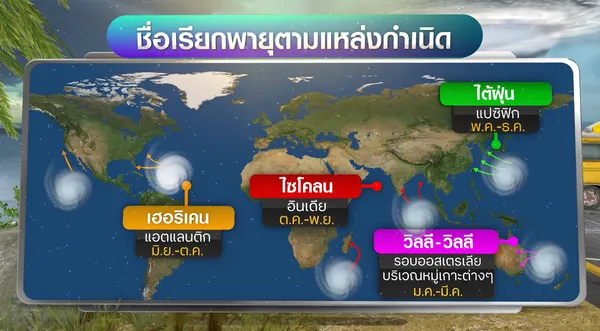 • ไซโคลน : เกิดในมหาสมุทรอินเดีย มักก่อตัวช่วงเดือนตุลาคมถึงพฤศจิกายน