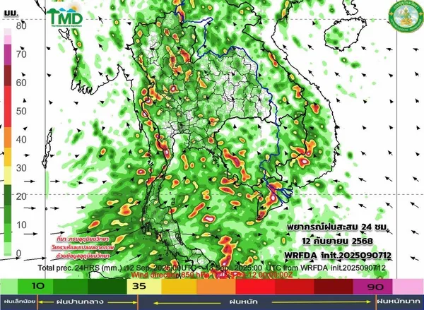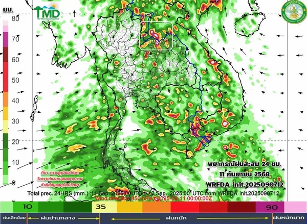 กรมอุตุนิยมวิทยาคาดการณ์ในช่วงวันที่ 10 – 11 ก.ย. ประเทศไทยมีฝนตกหนักบางแห่ง โดยมีฝนตกหนักมากบางพื้นที่ในภาคตะวันออกเฉียงเหนือ และภาคตะวันออก รวมทั้งกรุงเทพมหานคร และปริมณฑล เนื่องจากร่องมรสุมพาดผ่านภาคเหนือ และภาคตะวันออกเฉียงเหนือตอนบน ประกอบกับมรสุมตะวันตกเฉียงใต้กำลังปานกลางพัดปกคลุมทะเลอันดามัน ภาคใต้ และอ่าวไทย