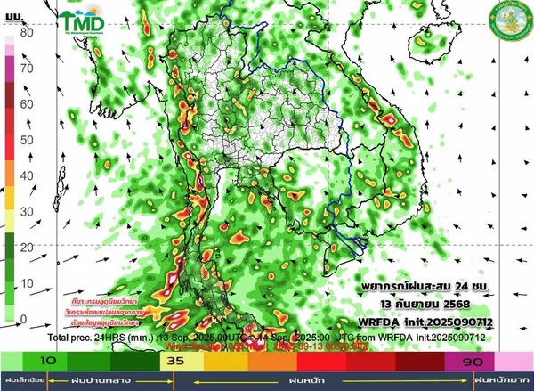 ส่วนในช่วงวันที่ 12 – 15 ก.ย. ภาคเหนือตอนบน และภาคตะวันออกเฉียงเหนือตอนบนจะเริ่มมีฝนลดลง ส่วนภาคเหนือตอนล่าง ภาคตะวันออกเฉียงเหนือตอนล่าง ภาคกลาง รวมทั้งกรุงเทพมหานครและปริมณฑล ภาคตะวันออก และภาคใต้ยังคงมีฝนตกหนักบางแห่ง เนื่องจากร่องมรสุมจะเลื่อนลงมาพาดผ่านภาคกลางตอนล่าง ภาคตะวันออก และภาคตะวันออกเฉียงเหนือตอนล่าง ประกอบกับมรสุมตะวันตกเฉียงใต้ที่พัดปกคลุมทะเลอันดามัน ภาคใต้ และอ่าวไทยยังคงมีกำลังปานกลาง