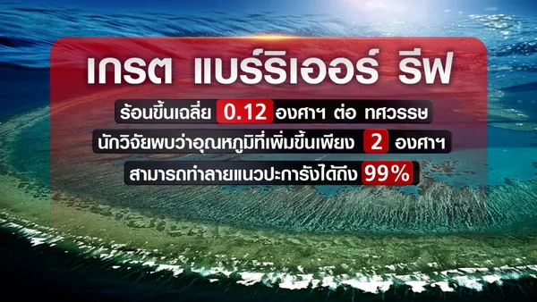 นักวิจัยพบว่า อุณหภูมิของ เกรตแบร์ริเออร์รีฟ ร้อนขึ้นทุกปี โดยร้อนขึ้นเฉลี่ยที่ 0.12 องศาเซลเซียสต่อทศวรรษ สำหรับปะการังแล้ว อุณหภูมิที่เพิ่มขึ้น 2 องศาเซลเซียส ก็เพียงพอที่จะทำลายแนวปะการังได้ถึง 99%