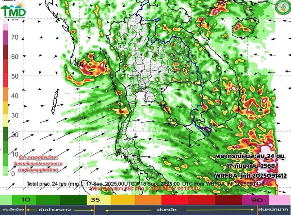 ในช่วงวันที่ 17 – 20 ก.ย. ขอให้ประชาชนบริเวณภาคเหนือตอนล่าง ภาคตะวันออกเฉียงเหนือตอนล่าง ภาคกลางรวมทั้งกรุงเทพมหานครและปริมณฑล ภาคตะวันออก และภาคใต้ ระวังอันตรายจากฝนตกหนักถึงหนักมากและฝนที่ตกสะสม ซึ่งอาจทำให้เกิดน้ำท่วมฉับพลันและน้ำป่าไหลหลาก โดยเฉพาะพื้นที่ลาดเชิงเขาใกล้ทางน้ำไหลผ่านและพื้นที่ลุ่ม