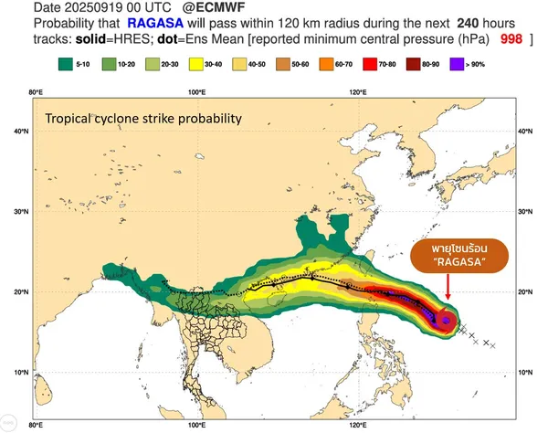 กรมอุตุนิยมวิทยา อัปเดตเส้นทางพายุโซนร้อน "รากาซา (RAGASA)" เย็นวันนี้ (19 กันยายน 2568) แม้ยังอยู่ไกล แต่มีแนวโน้มทวีกำลังแรงขึ้นอีก เนื่องจากยังอยู่ในมหาสมุทร อาจมีผลทางอ้อมต่อสภาพอากาศของไทยในช่วงสัปดาห์หน้า คาดว่าจะสลายหรืออ่อนกำลังก่อนเคลื่อนเข้าสู่ไทย อย่าได้ตื่นตระหนก อัพเดทและติดตามเป็นระยะๆ