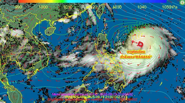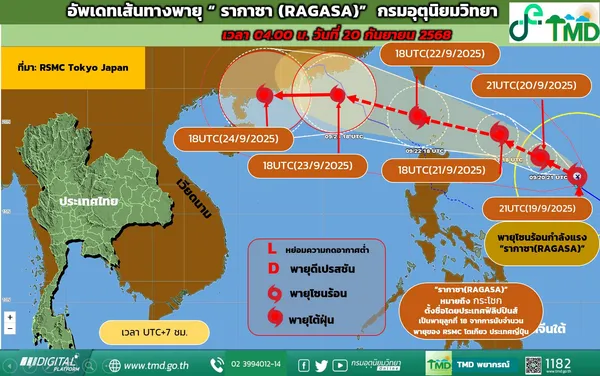 กรมอุตุนิยมวิทยา อัปเดตพายุ "RAGASA" เช้าวันนี้ 20 กันยายน 2568 จากพายุโซนร้อน ทวีกำลังแรงขึ้นเป็นพายุโซนร้อนกำลังแรง ศูนย์กลางยังอยู่ในมหาสมุทรแปซิฟิก (ทางตะวันออกของเกาะลูซอล ประเทศฟิลิปินส์)