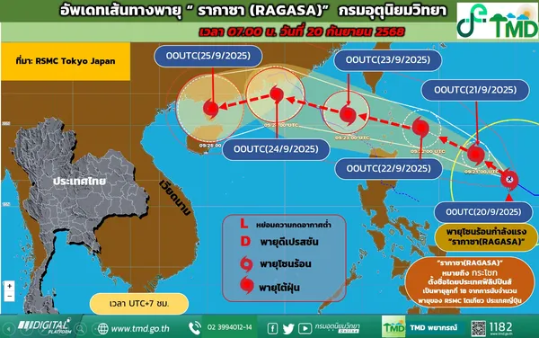 กรมอุตุนิยมวิทยา อัพเดตเส้นทางพายุ “รากาซา” (RAGASA) โดยในวันที่ 20 ก.ย. ทวีกำลังแรงขึ้นเป็นพายุโซนร้อนกำลังแรง มีศูนย์กลางอยู่ในมหาสมุทรแปซิฟิก บริเวณทางตะวันออกของเกาะลูซอน ประเทศฟิลิปปินส์ และคาดว่าจะทวีกำลังแรงขึ้นเป็นพายุไต้ฝุ่นในเร็ว ๆ นี้ ก่อนจะเคลื่อนตัวไปทางตะวันตกลงสู่ทะเลจีนใต้ ตอนบน