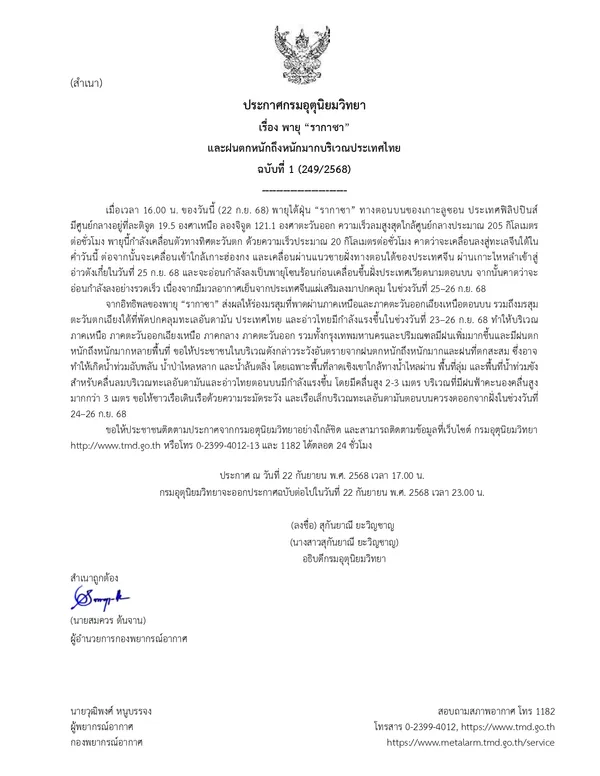กรมอุตุนิยมวิทยา ประกาศ เรื่อง พายุ “รากาซา” และฝนตกหนักถึงหนักมากบริเวณประเทศไทย ฉบับที่ 1 (249/2568)
