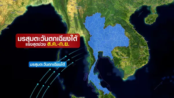 โดยตั้งแต่เดือนพฤษภาคมจนถึงประมาณกลางตุลาคม ไทยได้รับอิทธิพลจาก มรสุมตะวันตกเฉียงใต้ โดยช่วง สิงหาคม-กันยายน ลมมรสุมนี้มีความชื้นสูง พัดเข้าประเทศอย่างต่อเนื่องและแรงที่สุดในรอบปี โดยลมนี้จะพัดจากทะเลอันดามันผ่านฝั่งตะวันตก ทำให้มีฝนตกมาก โดยเฉพาะภาคเหนือ ภาคกลาง ภาคตะวันออก และภาคใต้ฝั่งตะวันตก