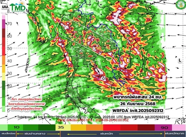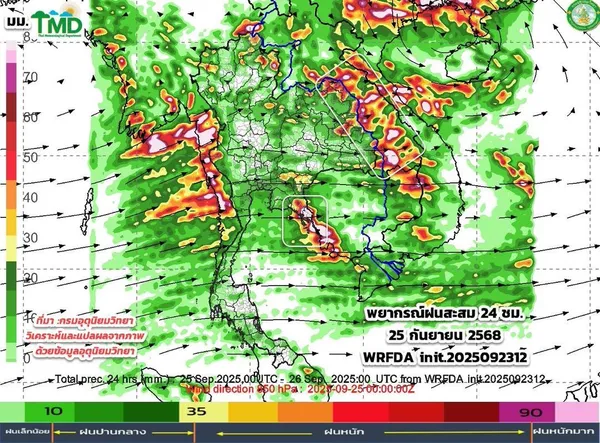 ในช่วงวันที่ 24 – 25 ก.ย. ภาคกลาง และภาคใต้ฝั่งตะวันตก มีฝนตกหนักบางแห่ง ส่วนภาคเหนือ ภาคตะวันออกเฉียงเหนือ และภาคตะวันออก มีฝนตกหนักถึงหนักมากบางพื้นที่ เนื่องจากร่องมรสุมที่พาดผ่านภาคเหนือ และภาคตะวันออกเฉียงเหนือมีกำลังแรงขึ้น ประกอบกับมรสุมตะวันตกเฉียงใต้ที่พัดปกคลุมทะเลอันดามัน ภาคใต้ ภาคกลาง ภาคตะวันออกเฉียงเหนือตอนล่าง ภาคตะวันออก และอ่าวไทยมีกำลังแรงขึ้นเป็นกำลังปานกลางถึงค่อนข้างแรง จากอิทธิพลของพายุไต้ฝุ่น “รากาซา” บริเวณทะเลจีนใต้ตอนบน คาดว่าจะเคลื่อนตามแนวชายฝั่งประเทศจีนตอนใต้ผ่านเกาะไหหลำลงสู่อ่าวตังเกี๋ย และในวันที่ 25 ก.ย. 68 จะเคลื่อนขึ้นฝั่งบริเวณประเทศเวียดนามตอนบน