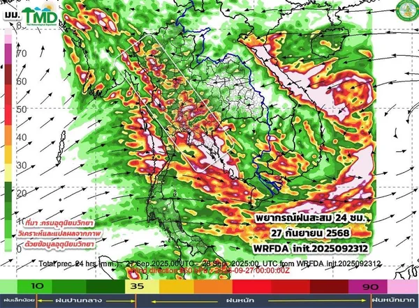 ในช่วงวันที่ 24 – 25 ก.ย. ภาคกลาง และภาคใต้ฝั่งตะวันตก มีฝนตกหนักบางแห่ง ส่วนภาคเหนือ ภาคตะวันออกเฉียงเหนือ และภาคตะวันออก มีฝนตกหนักถึงหนักมากบางพื้นที่ เนื่องจากร่องมรสุมที่พาดผ่านภาคเหนือ และภาคตะวันออกเฉียงเหนือมีกำลังแรงขึ้น ประกอบกับมรสุมตะวันตกเฉียงใต้ที่พัดปกคลุมทะเลอันดามัน ภาคใต้ ภาคกลาง ภาคตะวันออกเฉียงเหนือตอนล่าง ภาคตะวันออก และอ่าวไทยมีกำลังแรงขึ้นเป็นกำลังปานกลางถึงค่อนข้างแรง จากอิทธิพลของพายุไต้ฝุ่น “รากาซา” บริเวณทะเลจีนใต้ตอนบน คาดว่าจะเคลื่อนตามแนวชายฝั่งประเทศจีนตอนใต้ผ่านเกาะไหหลำลงสู่อ่าวตังเกี๋ย และในวันที่ 25 ก.ย. 68 จะเคลื่อนขึ้นฝั่งบริเวณประเทศเวียดนามตอนบน