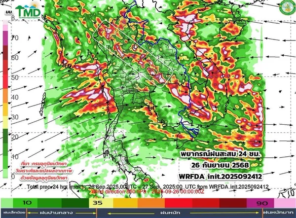 อุตุฯ เตือน 25-30 ก.ย.นี้ ทั่วไทยมีฝนตกต่อเนื่อง โดย 25-27 ก.ย.นี้ เนื่องจากร่องมรสุมที่พาดผ่านภาคเหนือ และภาคตะวันออกเฉียงเหนือมีกำลังแรงขึ้น ประกอบกับมรสุมตะวันตกเฉียงใต้ที่พัดปกคลุมทะเลอันดามัน ประเทศไทย และอ่าวไทยมีกำลังแรงขึ้นเป็นกำลังปานกลางถึงค่อนข้างแรง จากอิทธิพลของพายุไต้ฝุ่น “รากาซา”
