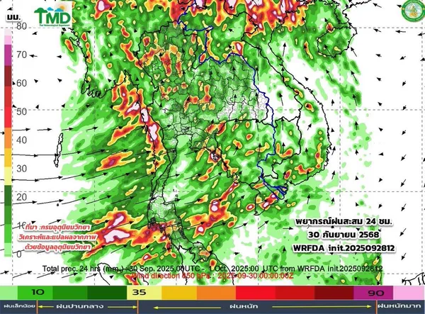 ในช่วงวันที่ 29 – 30 ก.ย. ประเทศไทยตอนบนมีฝนตกหนักถึงหนักมากหลายพื้นที่เนื่องจากร่องมรสุมกำลังแรงพาดผ่านภาคเหนือตอนล่าง ภาคกลางตอนบน และภาคตะวันออกเฉียงเหนือ ประกอบกับมรสุมตะวันตกเฉียงใต้ที่พัดปกคลุมทะเลอันดามัน ประเทศไทย และอ่าวไทยมีกำลังค่อนข้างแรง