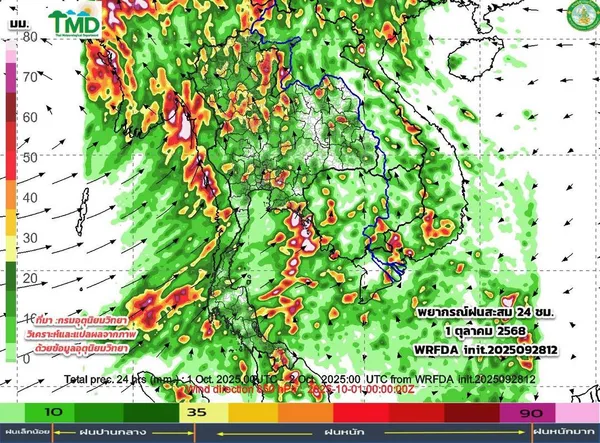 ในช่วงวันที่ 29 – 30 ก.ย. ประเทศไทยตอนบนมีฝนตกหนักถึงหนักมากหลายพื้นที่เนื่องจากร่องมรสุมกำลังแรงพาดผ่านภาคเหนือตอนล่าง ภาคกลางตอนบน และภาคตะวันออกเฉียงเหนือ ประกอบกับมรสุมตะวันตกเฉียงใต้ที่พัดปกคลุมทะเลอันดามัน ประเทศไทย และอ่าวไทยมีกำลังค่อนข้างแรง