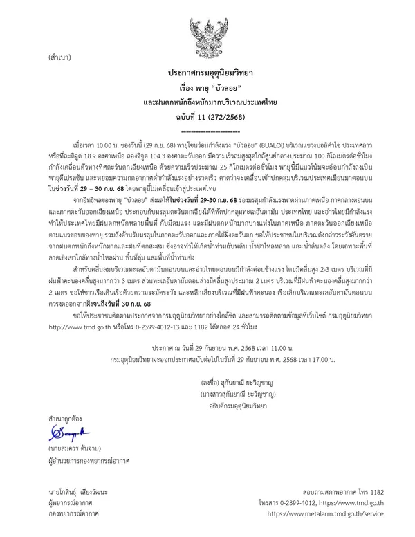 กรมอุตุนิยมวิทยา ประกาศเรื่อง พายุ “บัวลอย” และฝนตกหนักถึงหนักมากบริเวณประเทศไทย ฉบับที่ 11 (272/2568)
