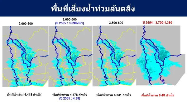 อย่างไรก็ตาม แม้ว่าปริมาณน้ำหลากจะไม่เทียบเคียงปี 2554 แต่ ระดับน้ำในบางพื้นที่อาจจะสูงกว่าได้ เนื่องจากเหตุผลสำคัญหลายประการคือ กว่า 10 ปีที่ผ่านมา ตอนบนไม่เอาน้ำ โดยมีการสร้างคันกั้นน้ำ ยกระดับถนน ก่อสร้างอาคาร และสาธารณูปโภคขวางทางน้ำ แย่งที่น้ำอยู่ บีบน้ำให้ลงแม่น้ำ ลำคลอง ทำให้น้ำมาเร็ว แรง รวมทั้งอิทธิพลน้ำทะเลหนุน จึงทำให้ระดับน้ำยกตัวเหมือนปี 2564-2565 ที่ผ่านมา กล่าวโดยรวมเราไม่เคยรู้ตัวเองเลยว่าทำอะไรไป เนื่องจากต่างหน่วยงานต่างทำ ผลกระทบตามมาเป็นอย่างไร จะเริ่มเห็นคันกั้นน้ำริมแม่น้ำ ลำคลองแตกชำรุดเป็นจุดๆ เข้าท่วมพื้นที่ชุมชน?
