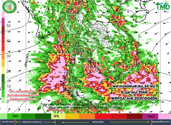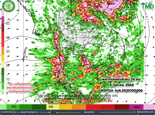 ประเทศไทยมีฝนฟ้าคะนอง และมีฝนตกหนักบางแห่งในภาคกลาง และภาคตะวันออก เนื่องลมตะวันออกเฉียงใต้พัดปกคลุมภาคตะวันออกเฉียงเหนือ ในขณะที่มรสุมตะวันตกเฉียงใต้กำลังอ่อนพัดปกคลุมทะเลอันดามัน ประเทศไทย และอ่าวไทย ส่วนในช่วงวันที่ 6 - 8 ต.ค. ประเทศไทยจะมีฝนเพิ่มขึ้น และมีฝนตกหนักบางแห่งในภาคเหนือ ภาคตะวันออกเฉียงเหนือ ภาคกลาง ภาคตะวันออก และภาคใต้ฝั่งตะวันตก เนื่องจากมรสุมตะวันตกเฉียงใต้ที่พัดปกคลุมทะเลอันดามัน ภาคใต้ และอ่าวไทย จะมีกำลังแรงขึ้น ประกอบกับมีร่องมรสุมพาดผ่านภาคเหนือ ภาคกลางตอนบน และภาคตะวันออกเฉียงเหนือ ในช่วงวันที่ 5 - 6 ต.ค. คลื่นลมบริเวณทะเลอันดามันตอนบนมีกำลังปานกลาง โดยมีคลื่นสูง 1 – 2 เมตร บริเวณที่มีฝนฟ้าคะนองคลื่นสูงมากกว่า 2 เมตร ทะเลอันดามันตอนล่างและอ่าวไทยมีคลื่นสูงประมาณ 1 เมตร บริเวณที่มีฝนฟ้าคะนองคลื่นสูงมากกว่า 2 เมตร