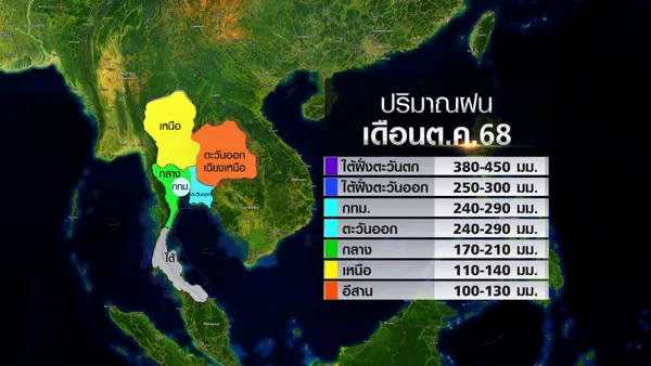 สำหรับปริมาณฝนในเดือนนี้มากกว่าปกติทุกภาค โดยภาคเหนือ กทม. และภาคตะวันออกจะมีฝนมากกว่าปกติร้อยละ 10 ส่วนภาคอื่น ๆ จะมีฝนมากกว่าปกติร้อยละ 20 พื้นที่ที่จะมีฝนตกหนักมากที่สุดคือ ภาคใต้ฝั่งตะวันตก 380-450 มม. รองลงมาคือภาคใต้ฝั่งตะวันออก 250-300 มม. กรุงเทพและปริมณฑล และภาคตะวันออก 240-290 มม. ภาคกลาง 170-210 ภาคเหนือ 110-140 มม. ส่วนพื้นที่ที่มีฝนน้อยที่สุด คือ ภาคอีสาน ประมาณ 100-130 มิลลิเมตร