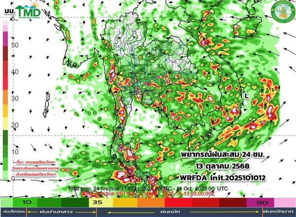 ช่วงวันที่ 11-13 ต.ค. ภาคกลาง รวมทั้งกรุงเทพมหานครและปริมณฑล ภาคตะวันออก และภาคใต้มีฝนตกหนักบางแห่ง ส่วนภาคเหนือ และภาคตะวันออกเฉียงเหนือมีฝนลดลง เนื่องจากร่องมรสุมพาดผ่านภาคกลางตอนล่าง ภาคตะวันออก และภาคใต้ตอนบน ประกอบกับลมตะวันออกพัดปกคลุมภาคเหนือและภาคตะวันออกเฉียงเหนือ ในขณะที่มรสุมตะวันตกเฉียงใต้พัดปกคลุมทะเลอันดามัน ภาคใต้ และอ่าวไทย