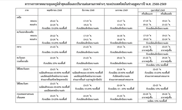 - ช่วงเวลาที่มีอากาศหนาวเย็นที่สุด ประมาณกลางเดือนธันวาคม 2568 ถึงต้นเดือนกุมภาพันธ์ 2569