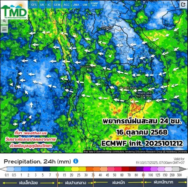 - พยากรณ์อากาศ 7 วัน ร่องมรสุมพาดผ่านภาคกลาง เตือนอีสาน กลาง ตะวันออก และใต้ ระวังฝนตกหนักช่วง 12-18 ต.ค.