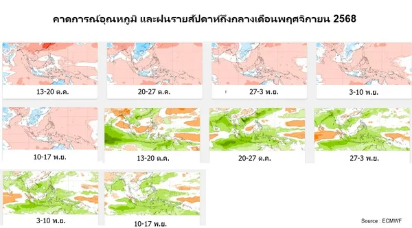 สำหรับการคาดการณ์อุณหภูมิ และปริมาณฝนรายสัปดาห์ พบว่าความกดอากาศสูงจะเริ่มแผ่ลงมาทำให้อุณหภูมิจะเริ่มลดลงตั้งแต่วันที่ 20 ตุลาคมนี้ ปริมาณฝนในภาคเหนือ ภาคตะวันออกเฉียงเหนือ รวมทั้งภาคกลาง และภาคตะวันออกยังคงมีฝนตกอยู่ในสัปดาห์แรกระหว่างวันที่ 13-20 ตุลาคม และจะเริ่มลดลง แต่ควรเริ่มเฝ้าระวังที่ภาคใต้ต่อไป