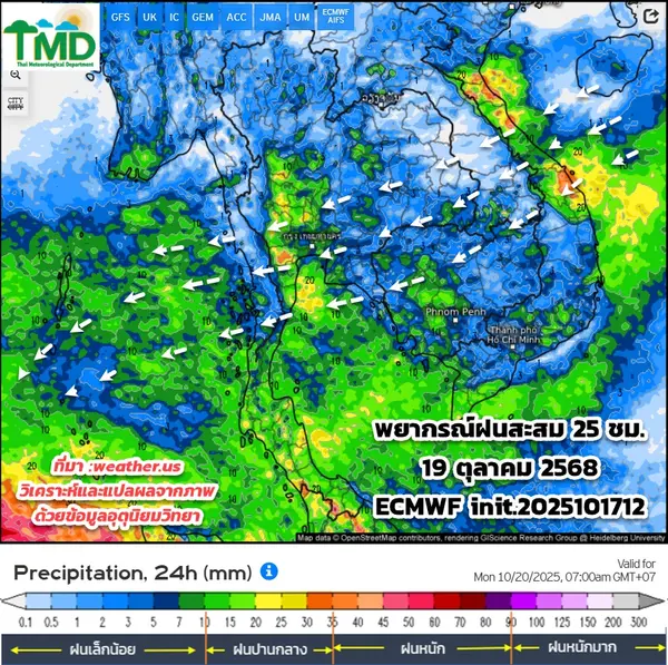 ในช่วงวันที่ 18 – 20 ต.ค. ประเทศไทยมีฝนฟ้าคะนอง และมีฝนตกหนักบางแห่งในภาคกลางตอนล่าง รวมทั้งกรุงเทพมหานครและปริมณฑล ภาคตะวันออก และภาคใต้ เนื่องจากลมตะวันออกและลมตะวันออกเฉียงใต้พัดปกคลุมอ่าวไทย ประเทศไทย และทะเลอันดามัน สำหรับบริเวณทะเลอันดามันและอ่าวไทย มีคลื่นสูงประมาณ 1 เมตร บริเวณที่มีฝนฟ้าคะนองคลื่นสูงมากกว่า 2 เมตร