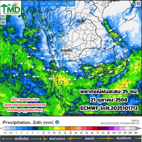ส่วนในช่วงวันที่ 21 – 24 ต.ค. ประเทศไทยตอนบนมีฝนน้อย โดยภาคเหนือ และภาคตะวันออกเฉียงเหนือเริ่มมีอากาศเย็นในตอนเช้า กับมีลมแรง และอุณหภูมิจะลดลง 1 - 3 องศาเซลเซียส ส่วนภาคใต้ยังคงมีฝนตกต่อเนื่อง และมีฝนตกหนักบางแห่ง โดยมีฝนตกหนักมากบางพื้นที่ในภาคใต้ฝั่งตะวันออก เนื่องจากบริเวณความกดอากาศสูงกำลังปานกลางจากประเทศจีนจะแผ่ลงมาปกคลุมประเทศไทยตอนบน ในขณะที่มีร่องมรสุมกำลังปานกลางพาดผ่านภาคใต้ตอนกลาง สำหรับคลื่นลมบริเวณอ่าวไทยตอนบนและห่างฝั่งทะเลอันดามันตอนบนจะมีกำลังแรงขึ้น โดยมีคลื่นสูง 1 - 2 เมตร บริเวณที่มีฝนฟ้าคะนองคลื่นสูงมากกว่า 2 เมตร ส่วนอ่าวไทยตอนล่างและทะเลอันดามันตอนล่างมีคลื่นสูงประมาณ 1 เมตร บริเวณที่มีฝนฟ้าคะนองคลื่นสูงมากกว่า 2 เมตร