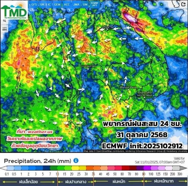 อุตุฯ เตือน 30 ต.ค.-4 พ.ย. ขอให้ประชาชนบริเวณประเทศไทยตอนบน และภาคใต้ตอนบน ระวังอันตรายจากฝนตกหนักและและฝนที่ตกสะสม ซึ่งอาจทำให้เกิดน้ำท่วมฉับพลันและน้ำป่าไหลหลาก โดยเฉพาะพื้นที่ลาดเชิงเขาใกล้ทางน้ำไหลผ่านและพื้นที่ลุ่มไว้ด้วย