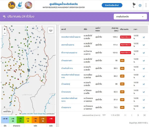 จากศูนย์ข้อมูลน้ำระดับ จังหวัดเชียงใหม่ รายงานปริมาณน้ำฝนสะสมบริเวณหน่วยจัดการต้นน้ำแม่ลาน ต.สะเมิงใต้ อ.สะเมิง วัดปริมาณฝนได้ 129.4 มิลลิเมตร ส่วนที่สะพานน้ำแม่ขาน วัดปริมาณฝนได้ 111.4 รวมถึงที่ว่าการอำเภอแม่วาง ต.บ้านกาด อ.แม่วาง วัดปริมาณฝนได้ 99.2 มิลลิเมตร
